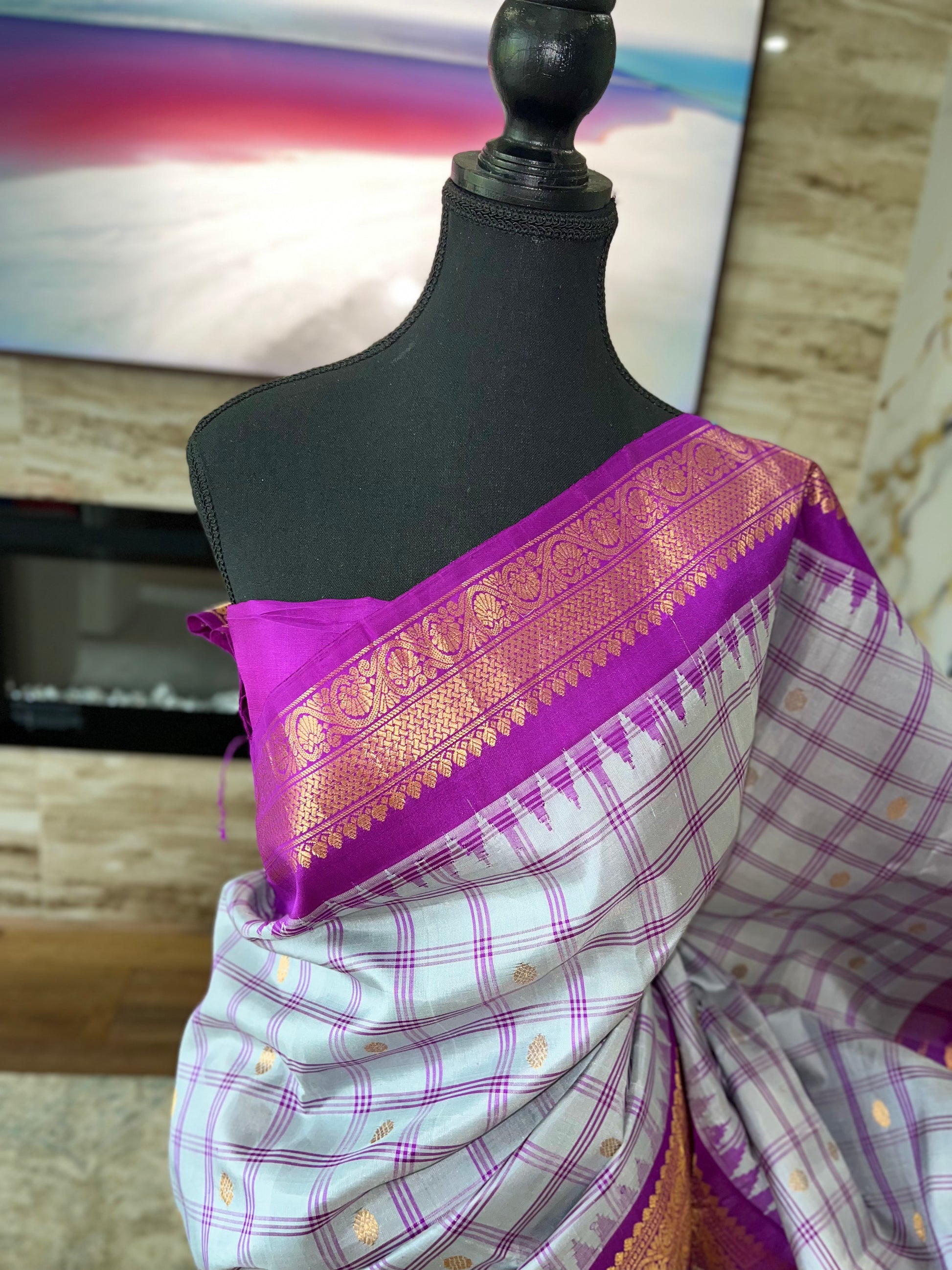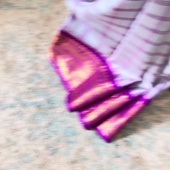 Varnitha is an ode to timeless elegance, handwoven in the legendary looms of Gadwal, where heritage and artistry blend seamlessly. The saree’s ash grey body is adorned with subtle kattam checks in magenta pink, symbolizing harmony, grace, and tradition.