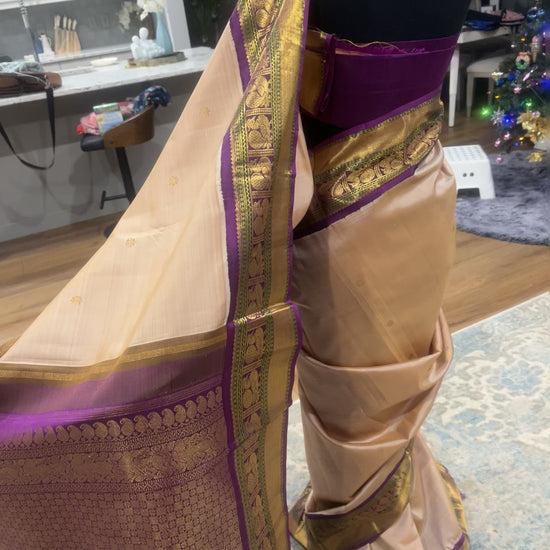 Celebrate timeless tradition with Sharada, a handwoven Kanjeevaram pure silk saree crafted in the classic Korvai weaving technique. The body, in a graceful sandalwood shade, exudes warmth and elegance, beautifully complemented by a striking purple contrast border adorned with traditional Annam (mythical bird) motifs, symbolizing prosperity and refinement.