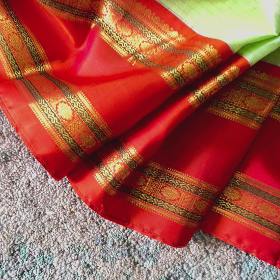 Woven in the timeless tradition of Kanchipuram, Hemavathi radiates grace and grandeur. The body glows in a serene pista green kattam (checks) weave, symbolizing freshness and elegance. Framing its beauty is a dark orange retta pett border, bold yet harmonious, carrying the essence of heritage craftsmanship.